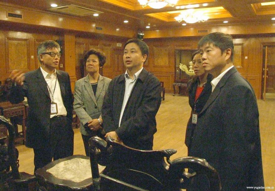 2006年11月6日,中共黄浦区委常委、黄浦区副区长、黄浦区文物管理委员会主任蔡志荣同志(左三)在黄浦区文化局党委书记、局长查小玲同志(左二)的陪同下,来到我园,深入调研豫园的文物保护工作。