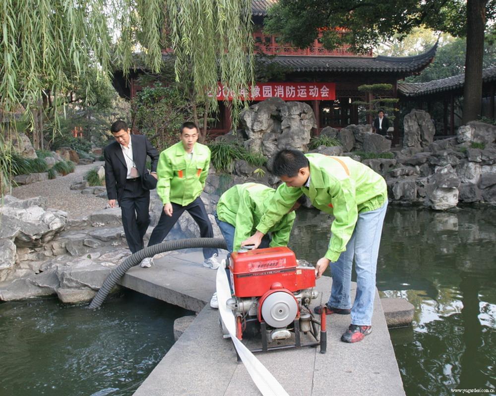 2006年11月9日,豫园举行了一年一度由全体豫园员工参加的消防运动会。图为由豫园青年职工组成的豫园义务消防队正在进行消防实战演习。