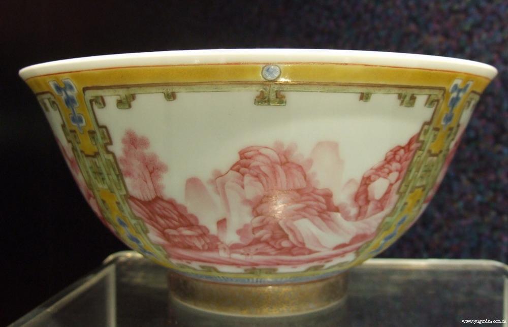 此次展览由上海市收藏鉴赏家协会、上海豫园管理处、上海市静安收藏协会联合举办,共展出展品98件套,以瓷、玉、铜和牙犀、砚印等杂件为主体,件件精巧奇绝。最为珍贵的是清乾隆御窑珐琅彩开光胭脂红山水人物九桃碗(见图)。这个估价近亿元的瓷器,是一件不可多得的艺术珍品,值得多加观赏。