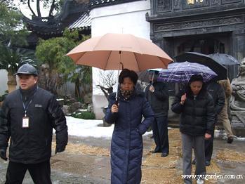 2008年1月28日下午,黄浦区文化局党委书记、局长查小玲(左二)专程来园视察了豫园的雪后防范工作后,对豫园所做的各项防范措施表示满意。查书记要求豫园一定要继续做好各项雪后防范工作,确保园内文物万无一失。同时,她还要求豫园认真细致的做好开放接待工作,处处为游客着想,尽全力保障游客的人身安全。