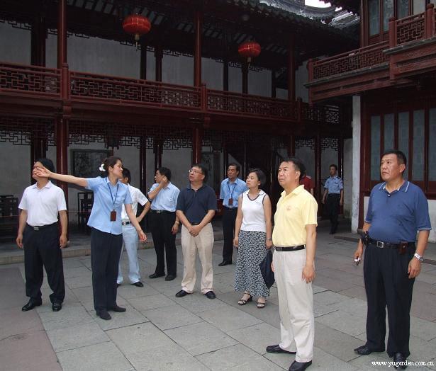 2008年7月4日,四川省汶川县公安系统抗震英模报告团一行来园参观访问,受到了豫园全体员工的热情接待。图为抗震英模们在仔细聆听豫园历史典故介绍。
