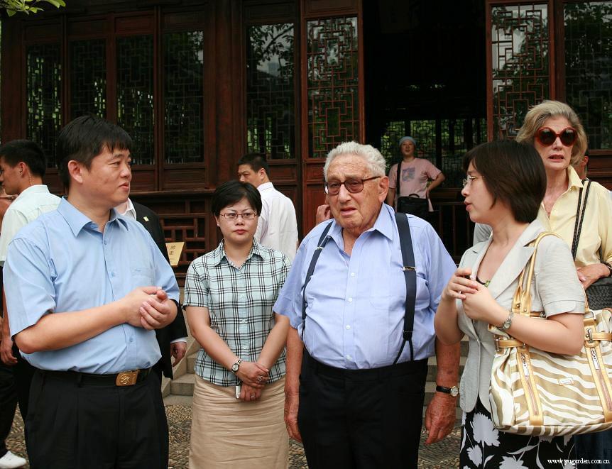 2008年8月14日,美国前国务卿基辛格博士(左三)及夫人(右一)来园参观访问。基辛格博士在参观豫园后,还为豫园题字“我与家人非常高兴来到豫园参观访问,并深刻感受到了上海人民的热情和友谊”。