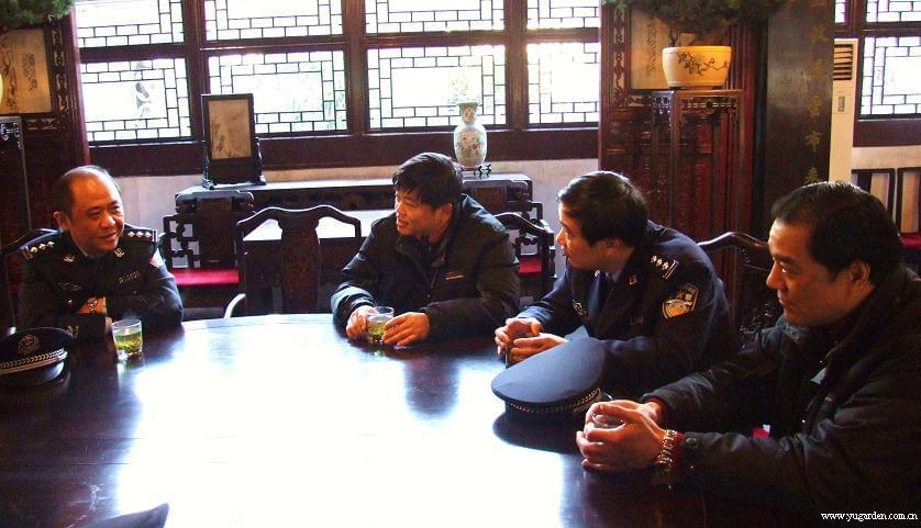 2009年1月1日,黄浦公安分局副局长朱毅(左一)来园视察,并听取豫园文物保护工作汇报。