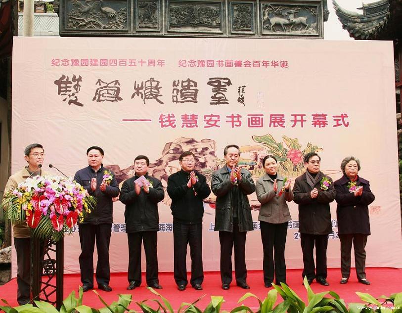 2009年3月3日,“豫园建园450周年和豫园书画善会成立100周年”庆祝系列活动之一的《双管楼遗墨—钱慧安书画展》在豫园涵碧楼前举行了隆重的开幕仪式。高式熊、戴敦邦、王宏喜、董之一、唐逸览、张森等百余位上海书画界的同仁参加了开幕式。图为今天开幕式上主席台列席贵宾:黄浦区政协主席赵矛(右四),中共黄浦区委常委、黄浦区委宣传部部长孙甘霖(右三),黄浦区人民政府副区长沈祖炜(右五),海上书画名家后裔联谊会副会长、钱惠安曾孙女、原南市区老领导钱德敏(右一),上海老城箱书画会会长、著名书画家、书画评论家毛国伦(右二),上海海派书画院院长、海上书画名家后裔联谊会会长、著名画家董之一(右六),黄浦区文化局党委书记刘学明(右七)。黄浦区文化局局长叶盛(右八)主持了今天的开幕仪式。