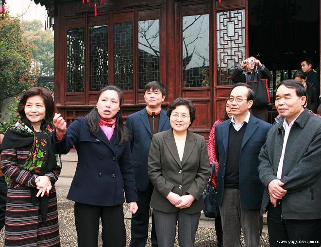 2009年4月4日,中央委员、中纪委委员、监察部部长兼国家预防腐败局局长马馼(左四)在上海市委常委、市纪委书记董君舒(右二),黄浦区委常委、区纪委书记温新华(左一)的陪同下,来园视察工作。