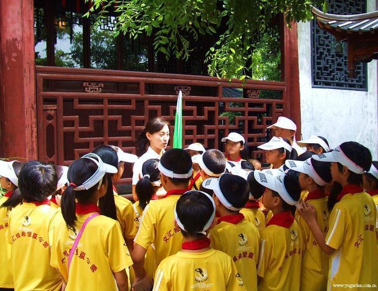 2009年7月26日,豫园热情接待参加“文汇报希望夏令营”的同学们来园参观游览。参加本次夏令营的都是由文汇报出资捐建的各地希望小学的学生们。图为豫园团员青年正在热情地为希望小学的同学们介绍豫园典故。