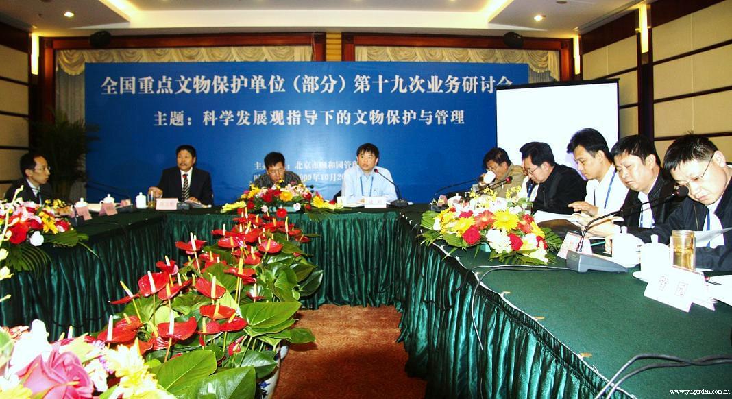 2009年10月20日至10月22日,全国重点文物保护单位(部分)第十九次业务研讨会在首都北京成功举行,本次研讨会由北京颐和园管理处主办。在3天的会期中,各地与会代表围绕“科学发展观指导下的文物保护与管理”这一主题,在“文物保护规划与文保单位的可持续发展”、“文物保护管理人才队伍建设与可持续发展”、“非物质文化遗产的保护与传承”、“现代科技在文物保护中的应用”以及“可移动文物的修复、保管与展陈”等议题上展开了热烈的研讨和交流,获得了很大的启示和共识,圆满完成了会议各项议程,达到了良好的预期效果,增进了彼此间的了解和友谊。图为与会单位代表正在交流文保经验和心得。