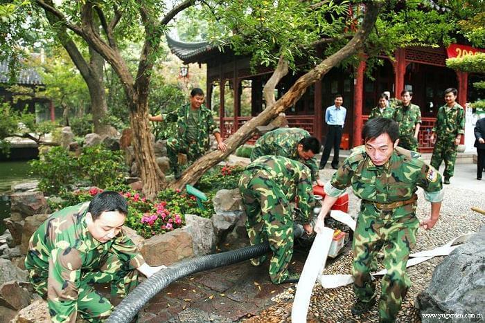 2009年11月9日早上7点,豫园举行了一年一度的消防实战演习。为了确保豫园这座“海上名园”的安全万无一失,在“她”欢度450岁生日之际,24名全部由豫园青年职工组成的义务消防队,分成4队,分别进行了精彩的消防实战演习。通过实战演练,既增强了义务消防队员们的实际操作能力,也提升了大家确保豫园文物安全的信心和决心。图为豫园义务消防队员们正在熟练地操作25匹手抬消防泵,进行实战出水演习。