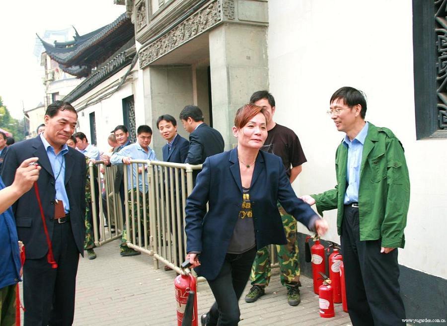 2009年11月9日,在“119消防日”到来之际,豫园全体职工积极投身到“2009豫园职工消防运动会”中,通过参加实战灭火折返跑等比赛项目,熟悉消防器材性能,掌握正确的灭火技能,以实际行动,贯彻“防患于未然”的豫园文物古建消防工作要求,切实保障豫园文物古建安全万无一失。图为豫园女职工正手拿灭火器,跑向“起火点”,进行灭火演练。