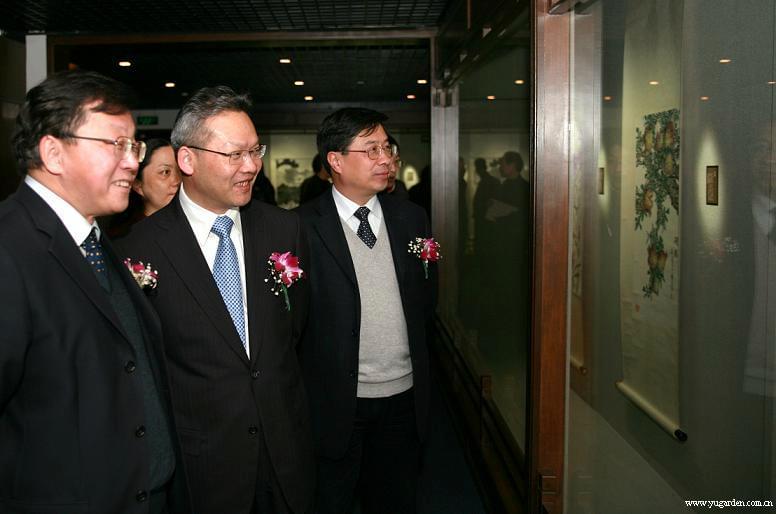 自2010年3月17日至4月18日,由上海市文史研究馆和上海豫园管理处联合举办的名为“翰林墨迹—上海市文史研究馆馆藏书画展”在豫园听涛阁展厅展出。 上海市文史研究馆成立于1953年,是具有统战性和荣誉性的文史机构。自创建之初,就坚持敬老崇文的宗旨,团结、凝聚了一大批具有文史专长的耆年名宿,因此文史馆有“当代翰林院”之称。上海文史馆研究馆自建馆以来,受市政府聘任的共有1136名馆员,其中专长绘画、篆刻的有数百人,不少书画篆刻家成就卓著,卓誉中外。 值此“中国2010年上海世界博览会”举办前夕,上海市文史研究馆从馆藏书画中,遴选出54幅书画作品,供广大观众览赏。 这54幅书画作品都是上海市文史研究馆馆藏中的精品。其中有吴昌硕、黄宾虹、齐白石、张元济、沈尹默、贺元健、沈迈士、潘学固、朱屺瞻、吴湖帆、王个簃、丰子恺、来楚生、江寒汀、潘伯鹰、钱君匋、叶露园、陆俨少、唐云等近现代书画大家的作品,反映了书画家们的不同流派、不同风格和面貌。 人寿有限,艺海无涯。艺术家的生命是有限的,但他们留下的艺术作品是永存的。历代文史馆员们不仅以自己的学识专长为当代社会做出了很大贡献,而且以饱满激情的丹青,不仅为馆员之家——上海市文史研究馆增光添彩,也为后人留下了一笔宝贵的文化遗产。此次展出正是一窥上海市文史研究馆馆藏书画作品全豹的极好机会,也必将成为世博前夕游览豫园的一个新亮点。 图为中共市委统战部副部长吴捷(右一)、上海市文史研究馆馆长沈祖炜(左一)、黄浦区区长周伟(中)正在欣赏展品。