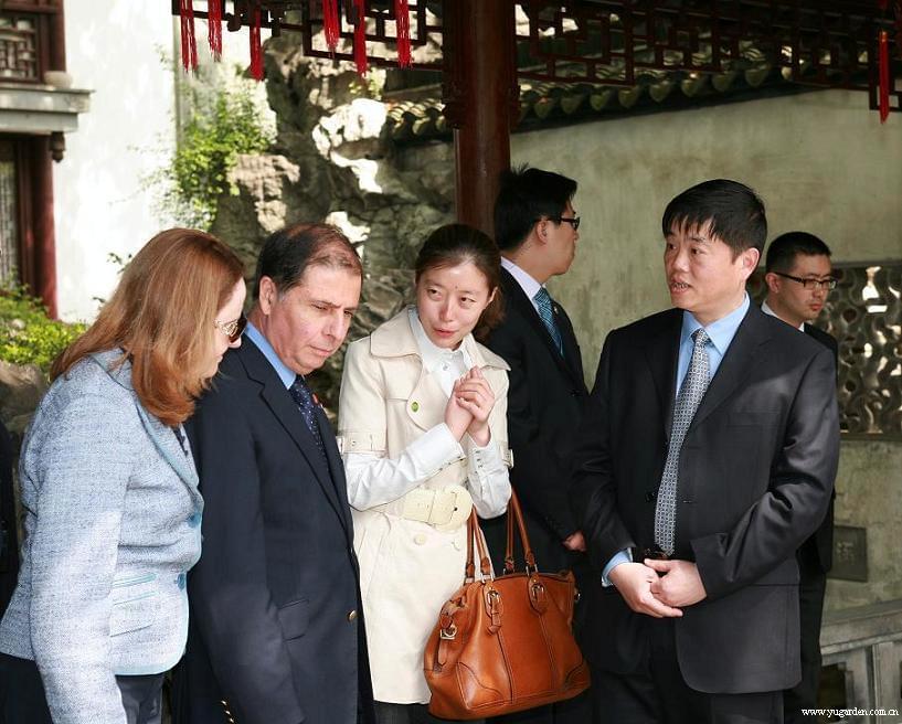 2010年4月29日,马耳他共和国总统乔治.阿贝拉(左二)一行在黄浦区人民政府区长周伟的陪同下来园参观访问,总统还为豫园题词“美丽而平静的园林,体现了中国人民爱好自然与平和的性格。”