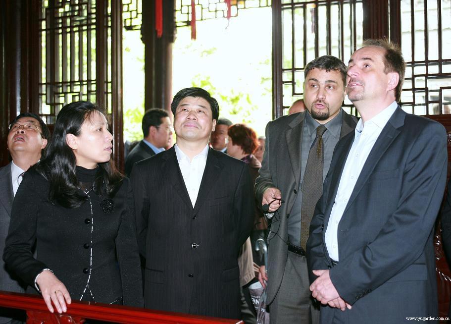 2010年5月16日,捷克副总理杨.科胡特(前排右一)一行在中共黄浦区委常委、副区长赵永峰(前排左二)的陪同下,来园参观访问。副总理为豫园题词:“豫园是中国最美丽的花园之一,我很荣幸来此参观。”