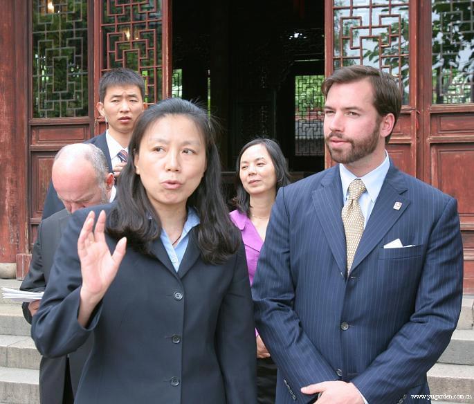 2010年6月1日,卢森堡大公储纪尧姆(前排右一)一行来园参观访问。大公储还为豫园题词:“很荣幸到豫园参观,感谢你们的热情接待”。