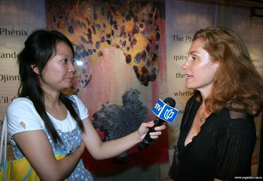 2010年7月8日至8月8日,豫园听涛阁展厅将举办《龙与凤—法国现代艺术展》。本次展览共展出法国艺术家卡塔琳娜.黑尔巴克.莫里叶创作的抽象画作品22幅。这是豫园首次举办国外现代艺术作品展。此次展览由上海豫园管理处与法国塞纳马恩省政府联合举办。图为法国艺术家卡塔琳娜.黑尔巴克.莫里叶(右)正在向新闻媒体介绍她的作品。