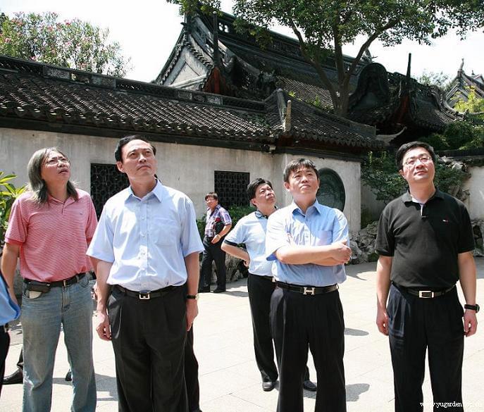 2010年8月27日,江西省委常委、南昌市委书记余欣荣(左二)一行在黄浦区人民政府副区长吴成(右一)的陪同下,来园参观访问。