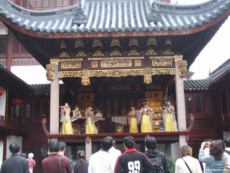 2006年4月26日开始,“瓷乐.石韵.顾绣”特色文化展在豫园开幕。“瓷乐”指的是从4月26日至6月10日,在豫园古戏台举行的中国景德镇“青花”女子瓷乐坊展演。“石韵”指的是从4月26日至6月10日,在豫园曲苑东西看廊举办的《吴江静思园藏灵璧石精品展》。“顾绣”指的是从4月26日至5月10日,在豫园听涛阁文物展厅举办的《上海露香园顾绣展》。图为众多游客正在观看景德镇瓷乐表演。