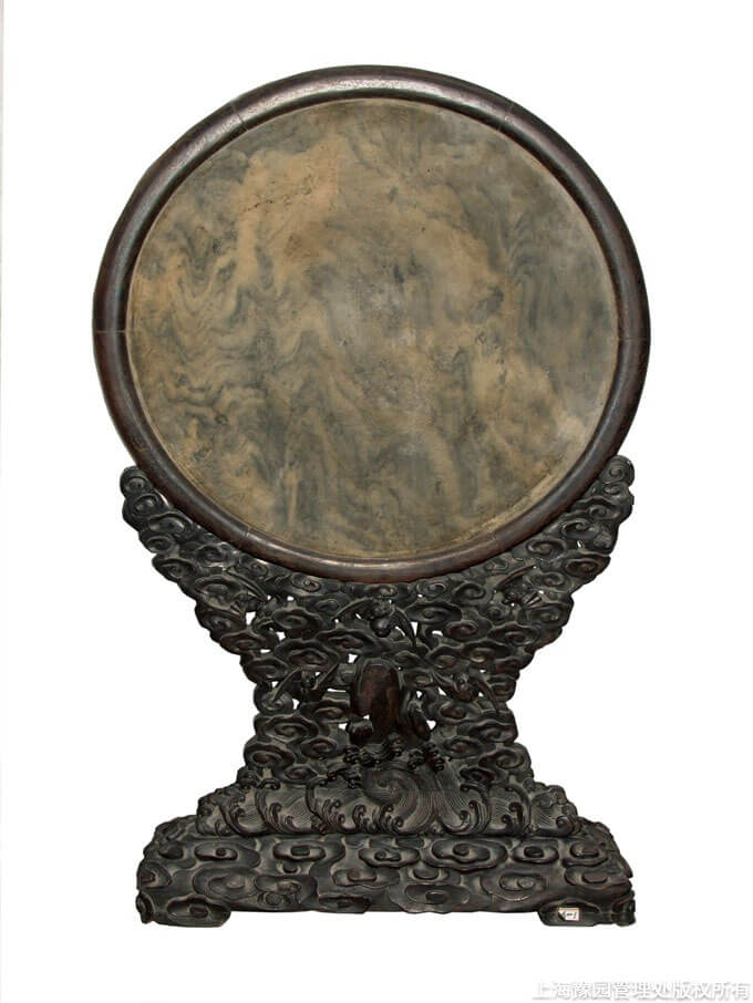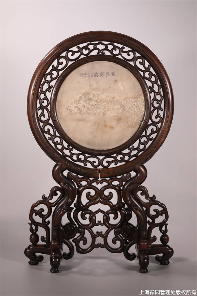 清·苍劲野渡红木座圆大理石插屏
