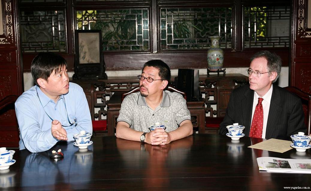 2010年5月24日,新西兰达尼丁市政府官员与达尼丁市“中国花园”管理人员来到豫园,参观学习豫园的管理与运营经验。图为豫园领导正向达尼丁市“中国花园”基金会主席兼“达尼丁—上海”友协主席黄君权(中)、达尼丁市政府首席执行官吉姆.哈伦(右)介绍豫园的运营及管理经验。